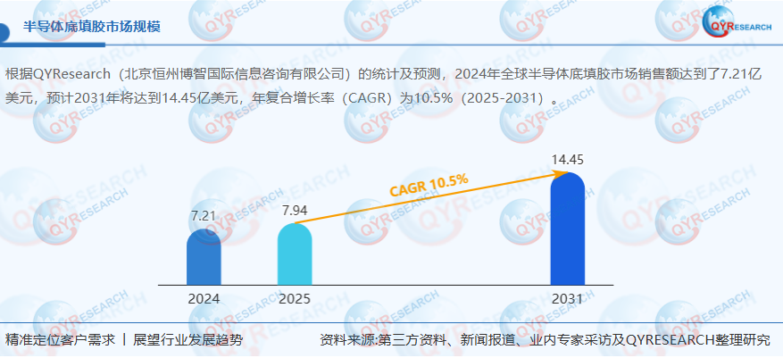半导体底部填充技术起源于20世纪70年代的IBM公司,最初应用于陶瓷基板领域,后随着有机基板取代陶瓷基板而实现规模化应用。全球半导体底部填充胶市场预计以10.48%的年复合增长率(CAGR)持续扩张,2024年市场规模达7.21亿美元,2031年将突破14.43亿美元。中国市场表现尤为突出,预计2031年全球占比将达24.72%,增速显著高于全球平均水平,这主要得益于新能源汽车、AI芯片、5G通信等新兴技术领域的快速发展。