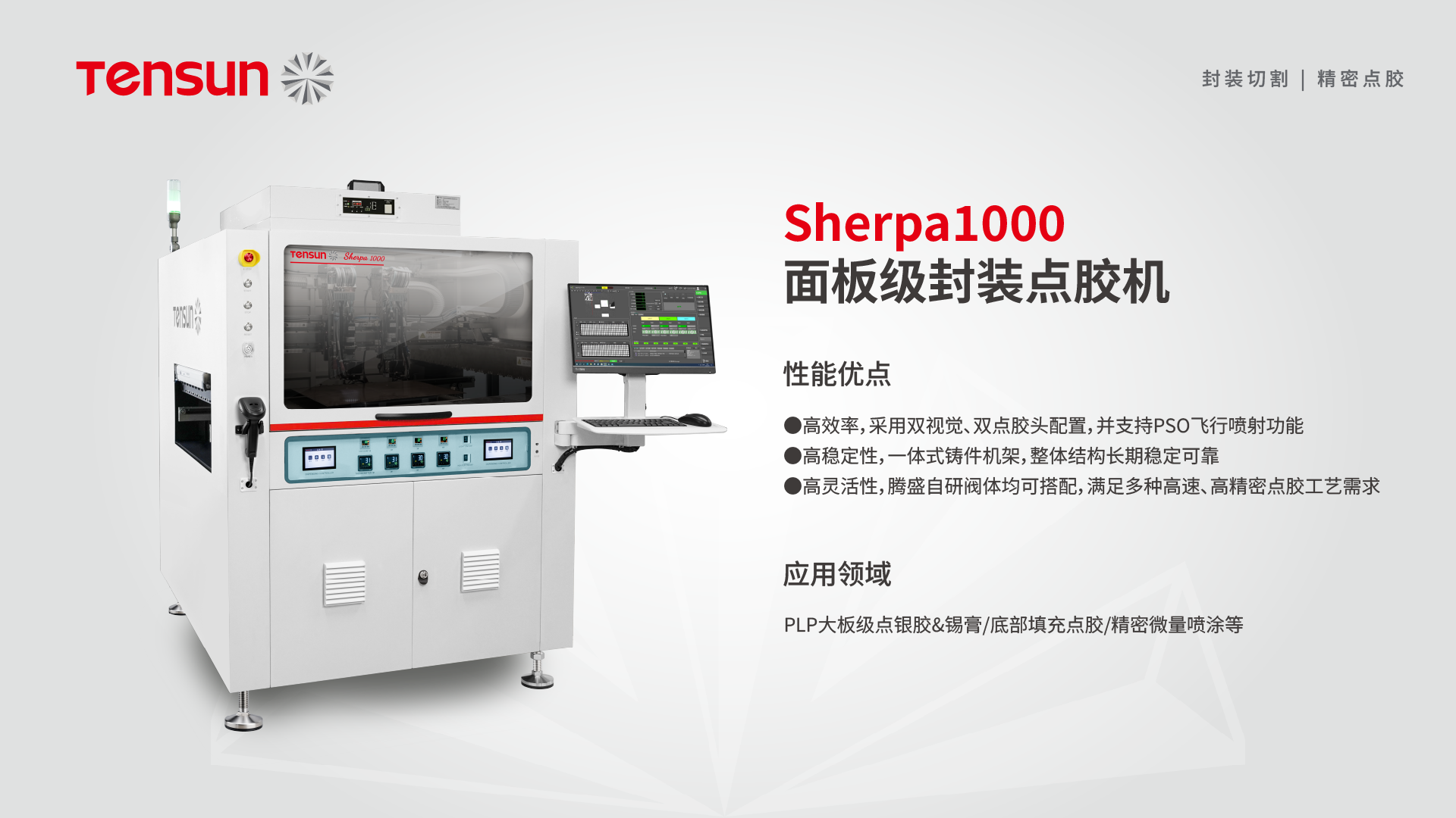 · 技术特点:采用一体式铸造成型工艺,搭载龙门双驱U型直线电机,点胶快准稳