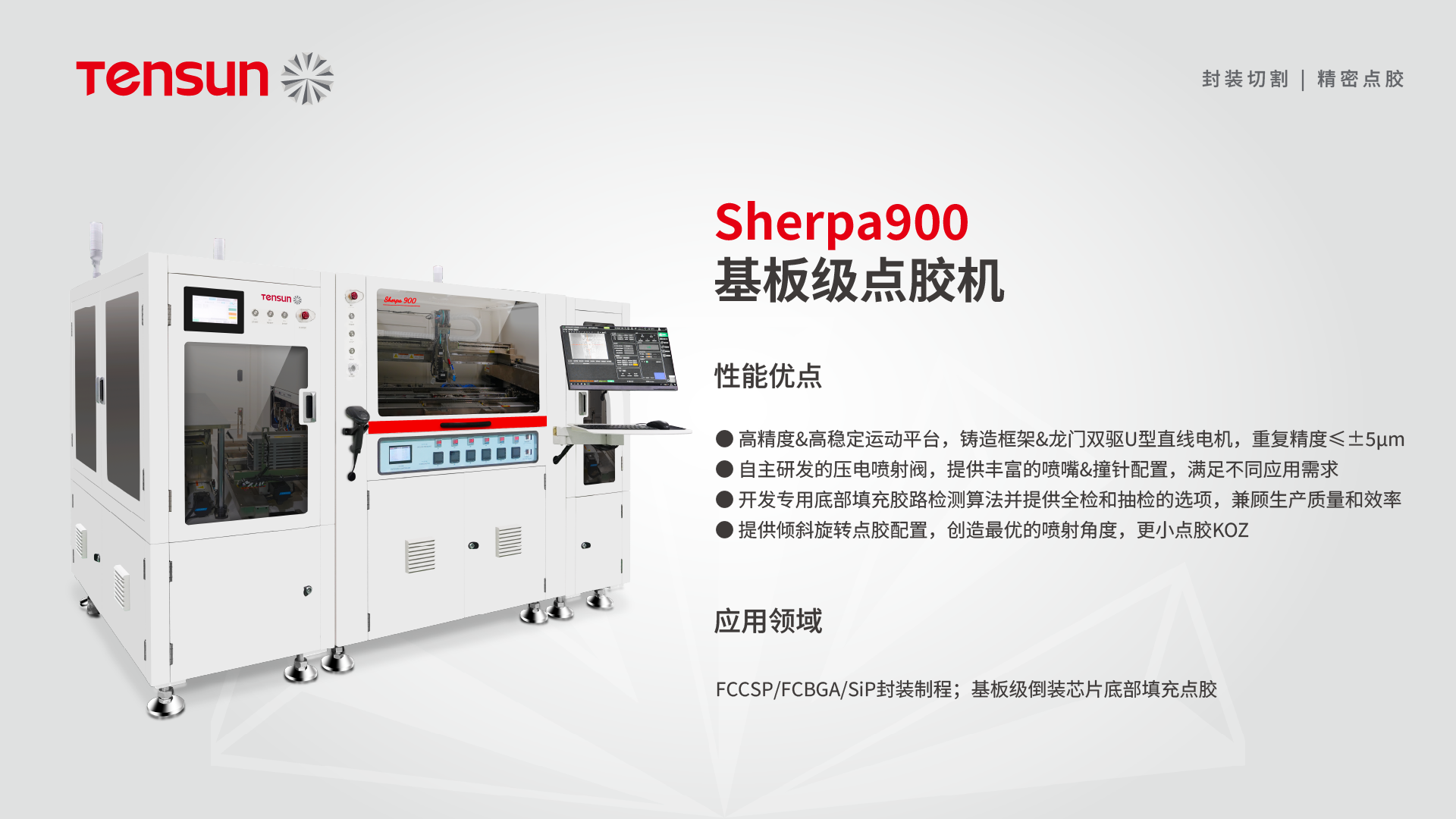 底部填充工艺作为半导体封装中的关键环节,虽然能显著提升器件可靠性,但在实际应用中仍面临多重技术挑战,主要包括填充不饱满、空洞形成、材料匹配、热管理、大尺寸芯片封装等核心难点。作为国内领先的精密装备企业,腾盛精密针对不同封装需求开发了专业化的底部填充设备: