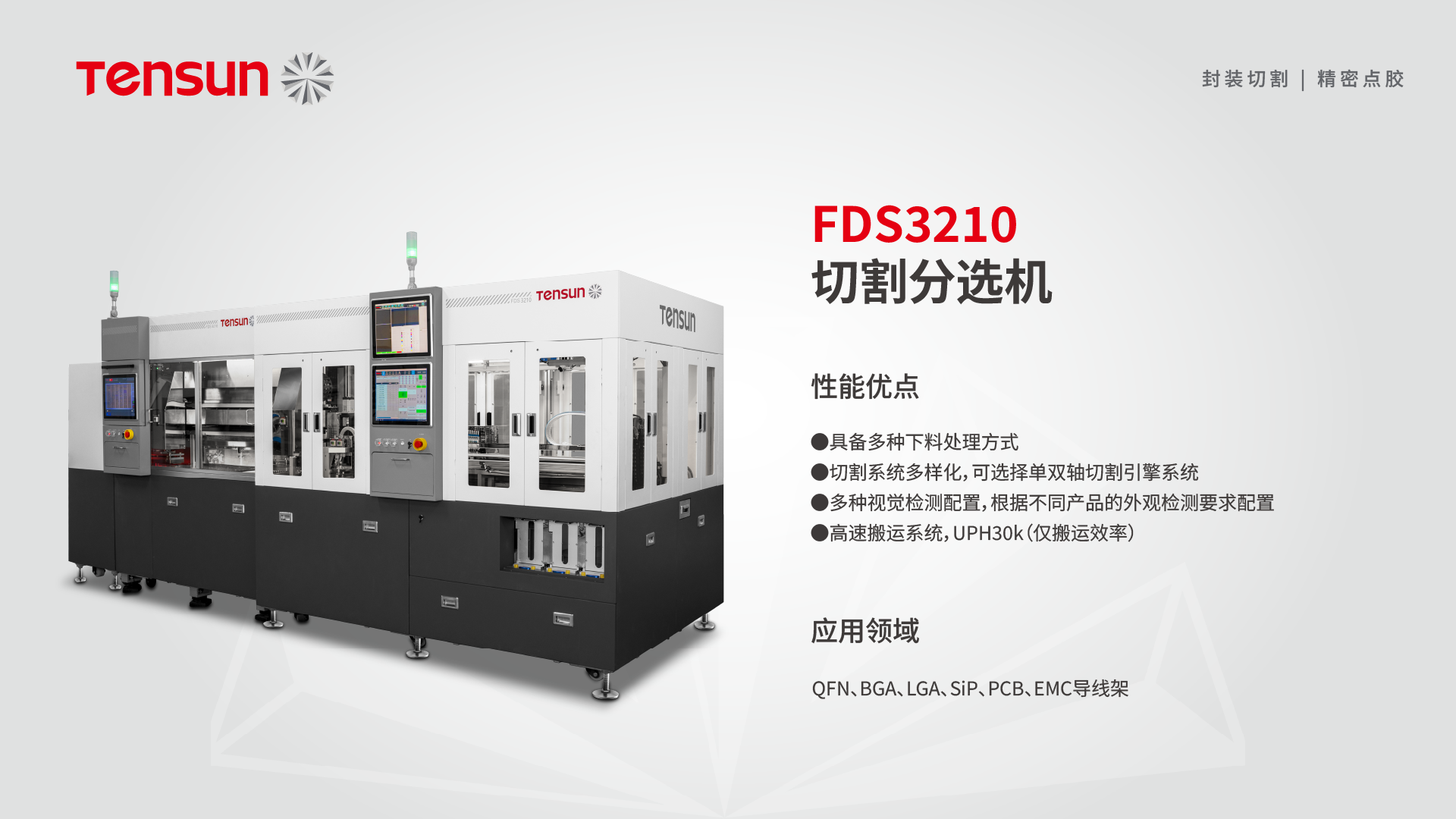 2026年3月,腾盛精密在上海SEMICON China展会上展出了其旗舰产品——切割摆盘一体机FDS3210。该设备集上料、切割、清洗、分选与摆盘等功能于一体,可兼容多种规格、多种类型产品,同时具备多种下料方式及多样化切割系统。设备装载了自主开发的VISION视觉平台,可提供丰富的视觉检测配置。在性能指标上,FDS3210的重复定位精度±0.001mm,能够满足QFN、BGA、MEMS、SiP等主流封装产品的精密切割需求。