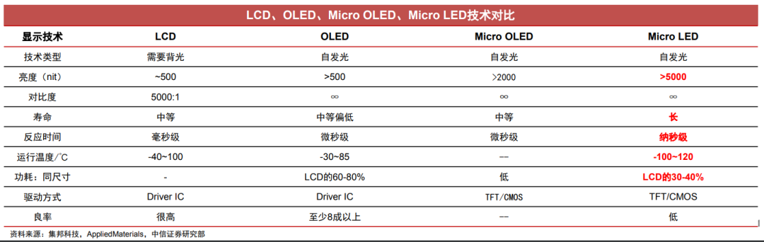 不少业内人士认为,Micro LED具备超高亮度、高对比度、高耐温性、低功耗等优点,且系统设计和集成较简单,理论上成本更低。从长期来看,Micro LED是下一代主流显示技术的重要选择,在众多领域均有替代现有技术的潜力,未来Micro LED的应用范畴比Micro OLED更广。